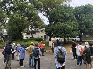 令和4年は江津湖フットパスを7回開催することができました。その内の春4回は「全国都市緑化フェアー」の事務局からの依頼分です。本当に有難いことです。毎回、多くの参加者がありました。7回のうち6回参加していただいた方もいらっしゃいます。この回数にはビックリですが、ガイド冥利で、うれしくなります。熊本大学の前身は五高であるが、五高時代ここに漕艇部の艇庫があった場所である。夏目漱石は明治29年4月第五高等学校の先生として、熊本に来ている。4年3か月英語をおしえていた。その間に漕艇部の部長もしていて江津湖にはよく足を運んだようである。水前寺公園でも、江津湖でも多くの俳句を詠んでいる。漱石は水前寺江津湖公園が大変、気にいっていたようである。